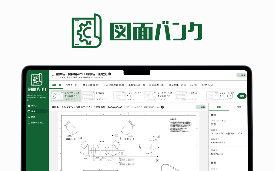 製造業における見積もり作成や部品の加工過程には「類似の過去図面を探し、参照する」ことへのニーズが高い一方、事業者は膨大な書類の管理に課題を抱えています。「図面バンク」は図面と関連書類(見積書、各種技術文書、CAD・CAMファイルなど)を紐づけてクラウドに保存・管理し、AIを活用することで何千、何万枚もある過去の図面から類似形状を即座に検索が可能です。これにより、特定の担当者に依存せず、必要な情報や過去のデータへのアクセスが可能となり、業務効率化が期待できることから、図面を探す手間と人件費の4割削減※を実現します。